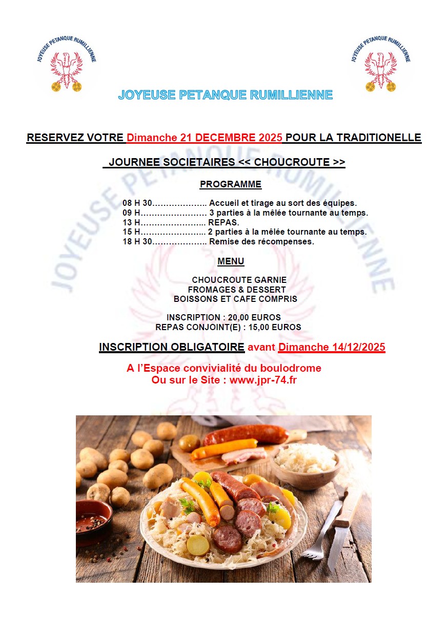 La journée sociétaires avec concours et choucroute se déroulera le dimanche 21 décembre 2025. Les inscriptions (obligatoires) sont ouvertes et s’achèveront le 14 décembre au soir.