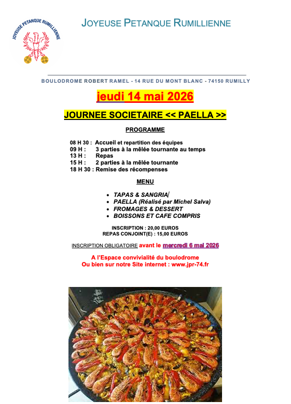 La journée Paella est programmée le jeudi 14 mai. La pré-inscription est obligatoire (sur le site ou au bar) jusqu’au 7 mai 20h.